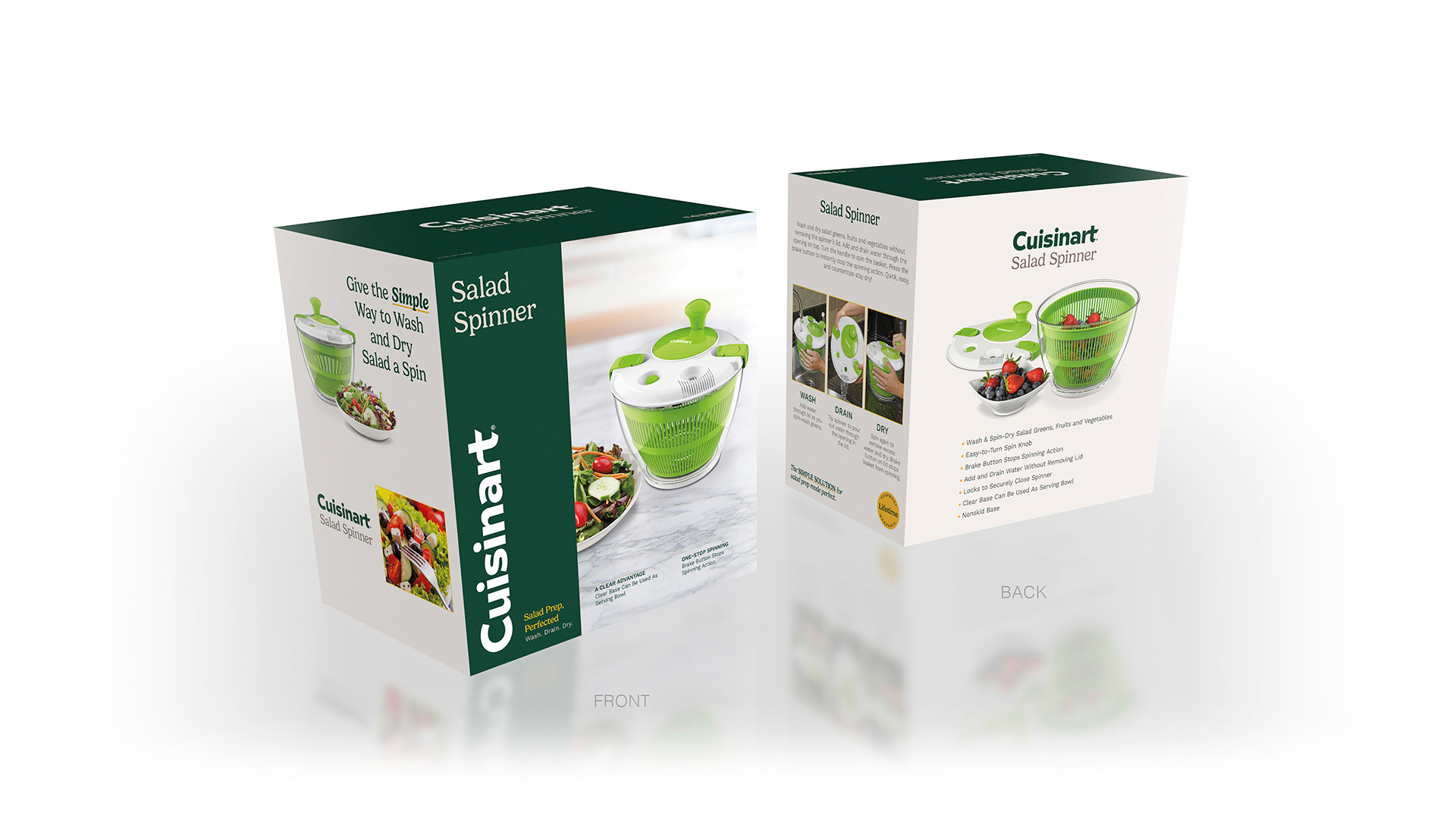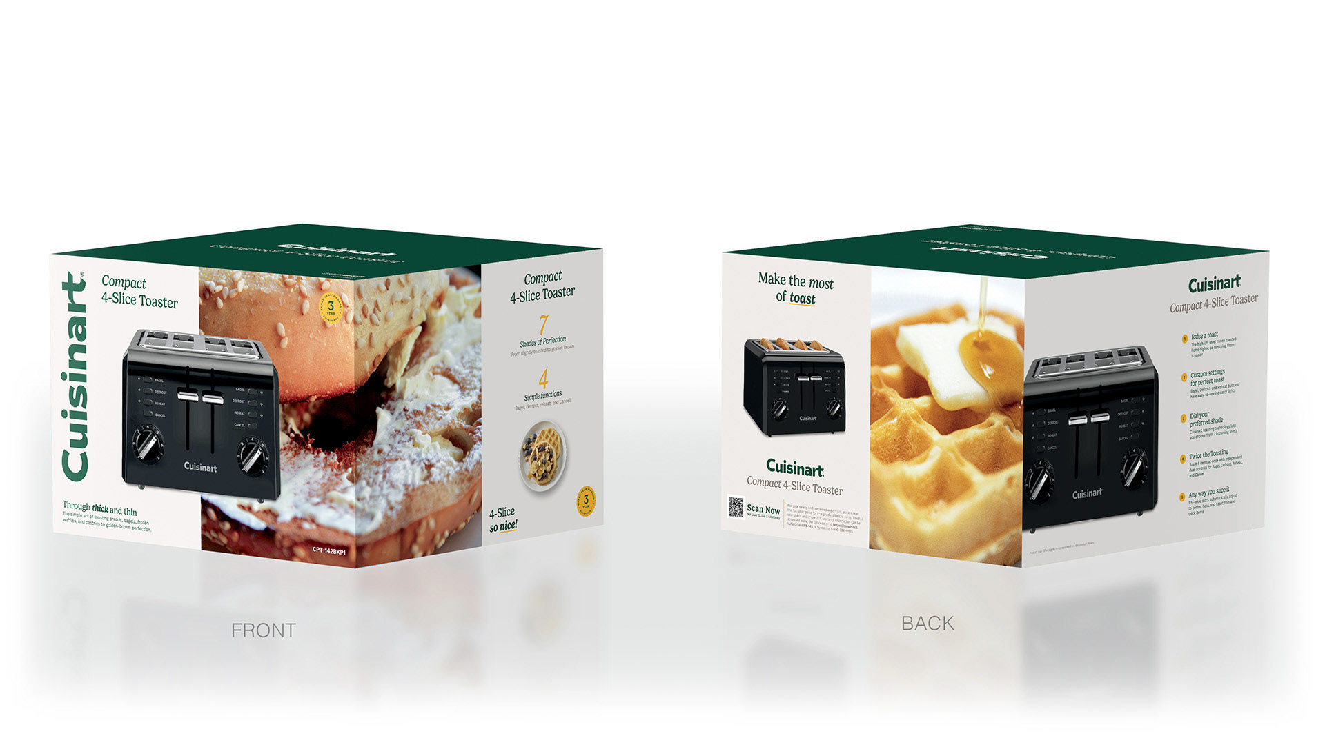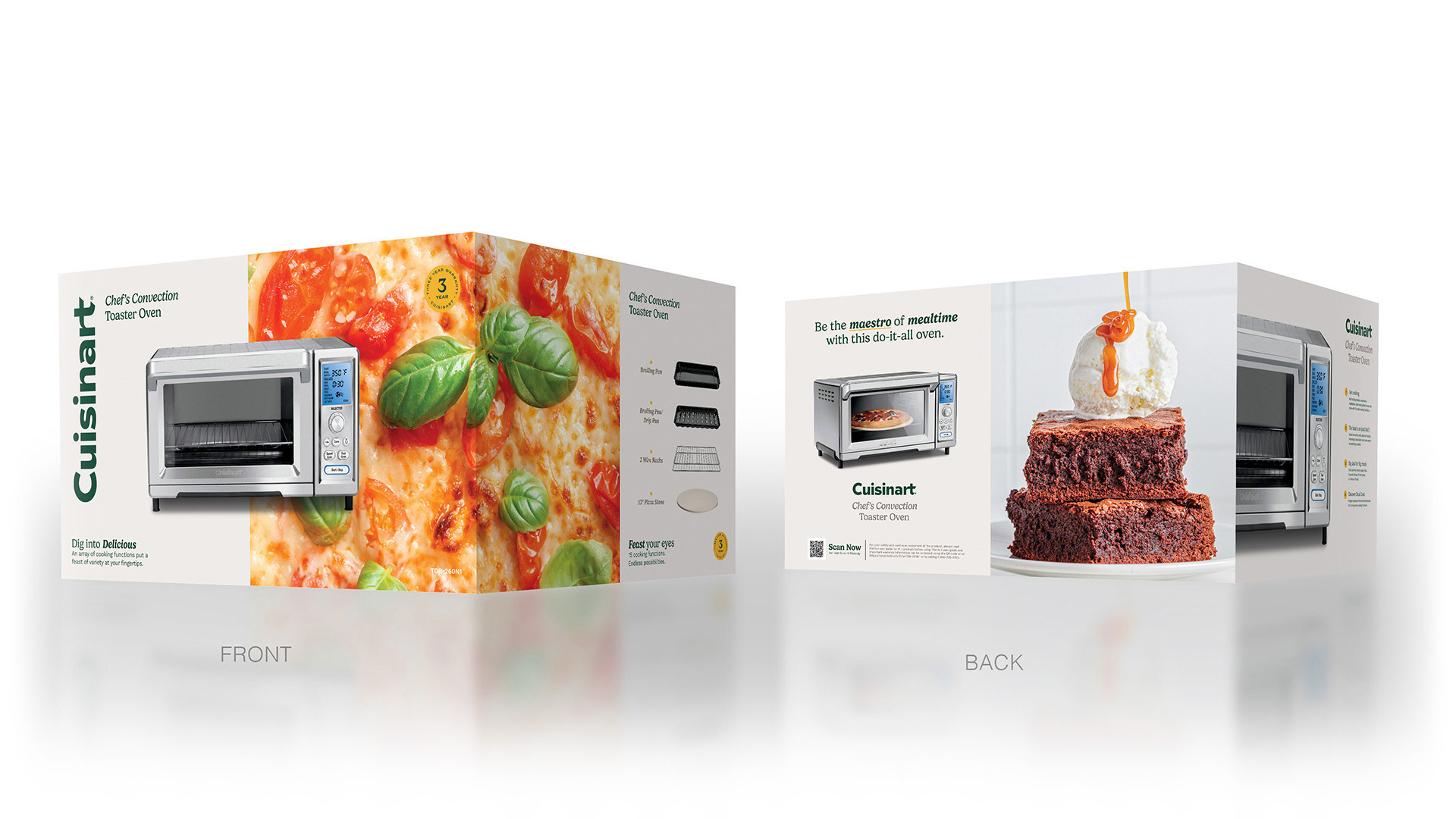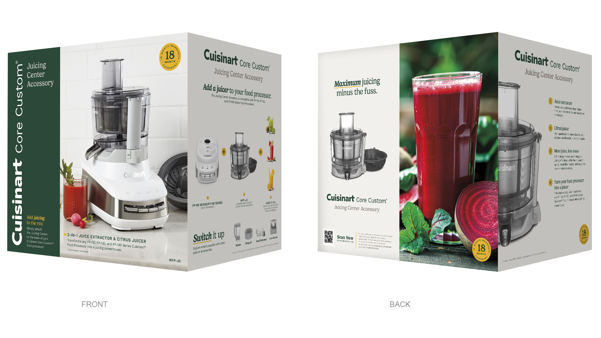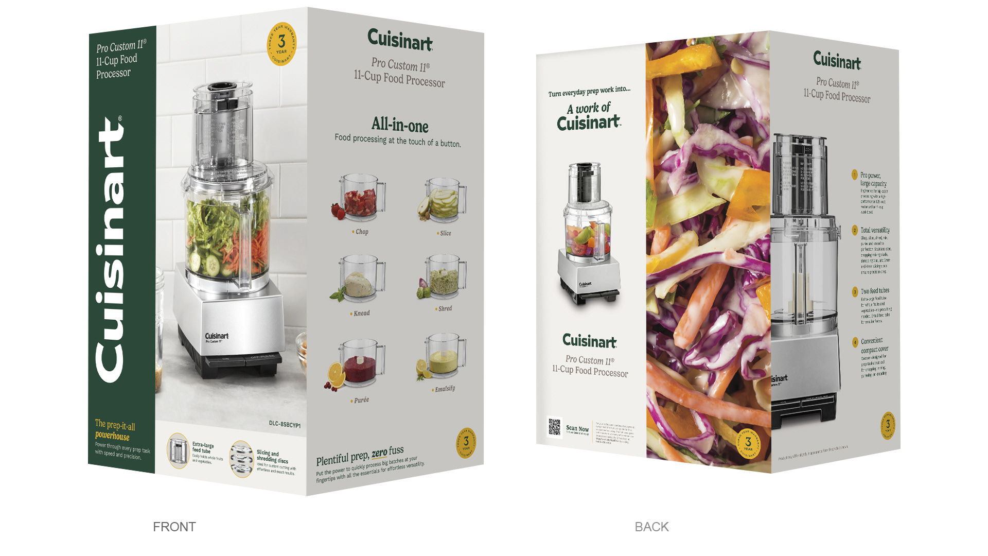CUISINART REBRANDING PROJECT Chosen by the Creative Director to oversee a complete visual and strategic transformation of the brand redesign, over 150 package mechs incorporating Cusinart's new brand identity. Responsible for concept and design layout of all aspects of each product including photo selections, photoshoots, and composition for each package. Executed from initial design to final art production using Conair's Indesign proprietary art process system. Streamlined and implemented efficiencies in their system for a smoother and quicker execution of packaging mechanicals.