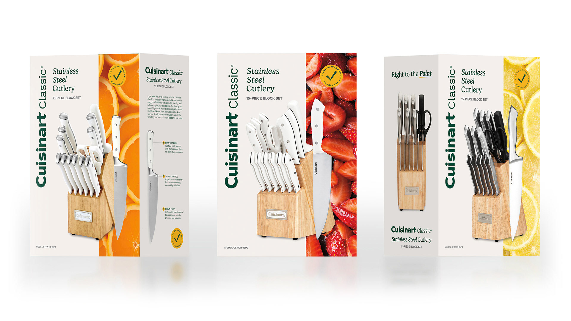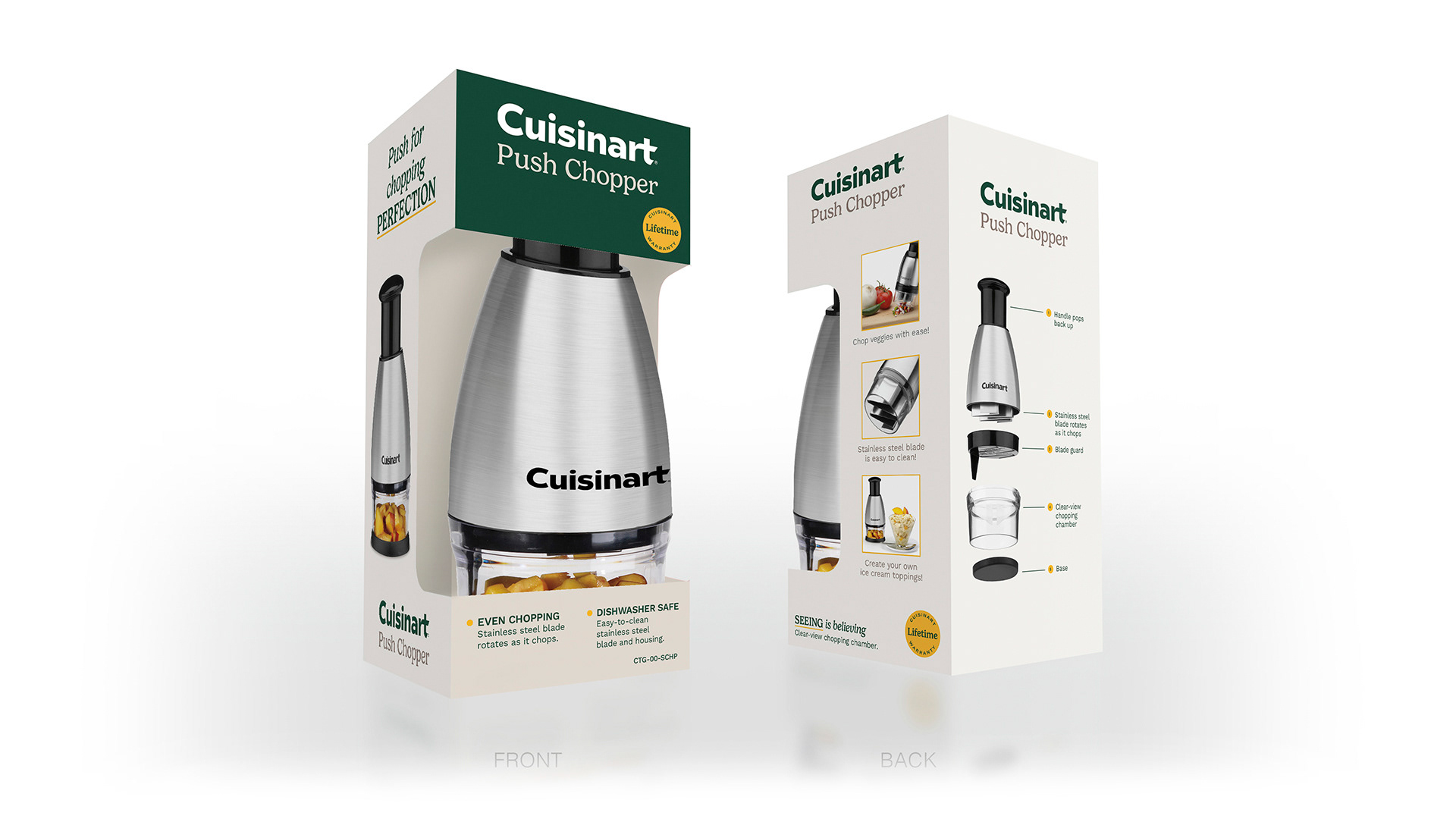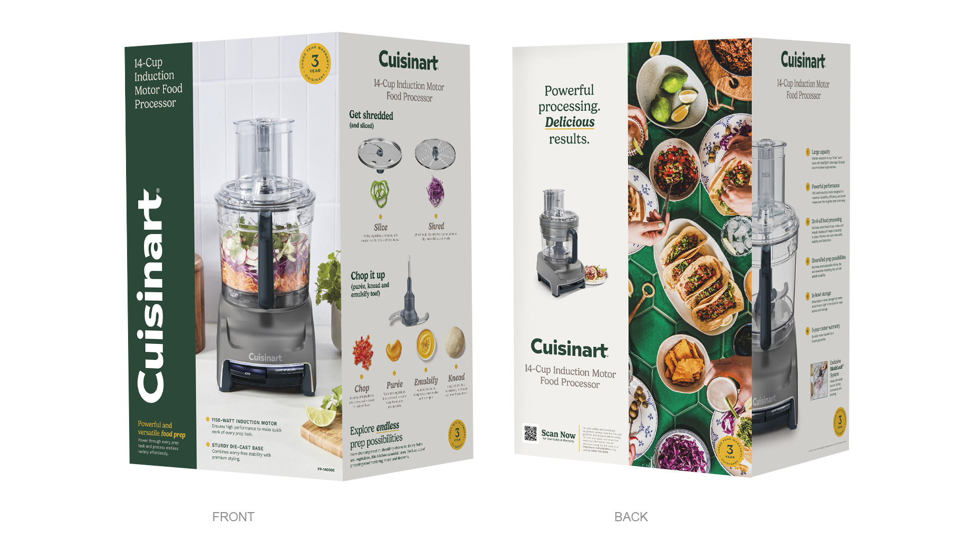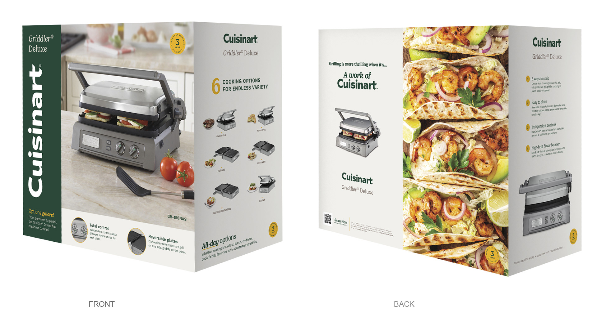 CUISINART REBRANDING PROJECT Chosen by the Creative Director to oversee a complete visual and strategic transformation of the brand redesign, over 150 package mechs incorporating Cusinart's new brand identity. Responsible for concept and design layout of all aspects of each product including photo selections, photoshoots, and composition for each package. Executed from initial design to final art production using Conair's Indesign proprietary art process system. Streamlined and implemented efficiencies in their system for a smoother and quicker execution of packaging mechanicals.