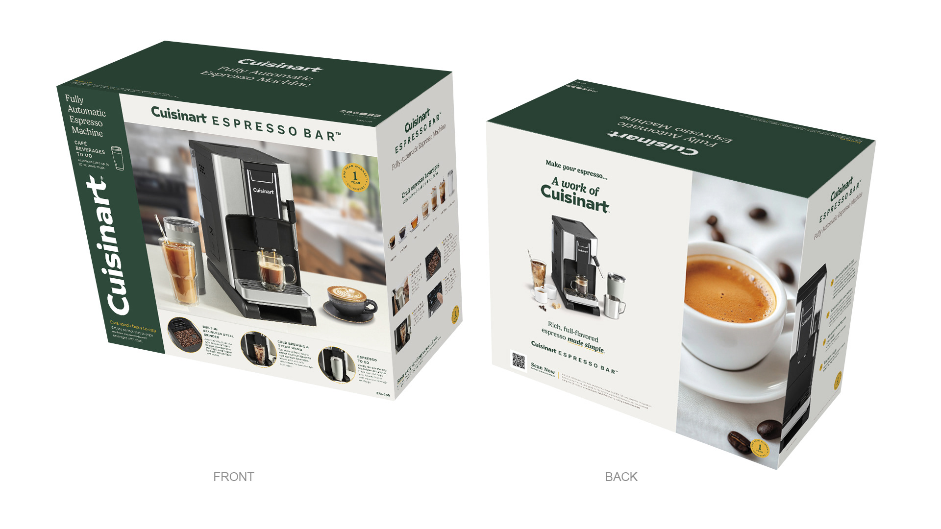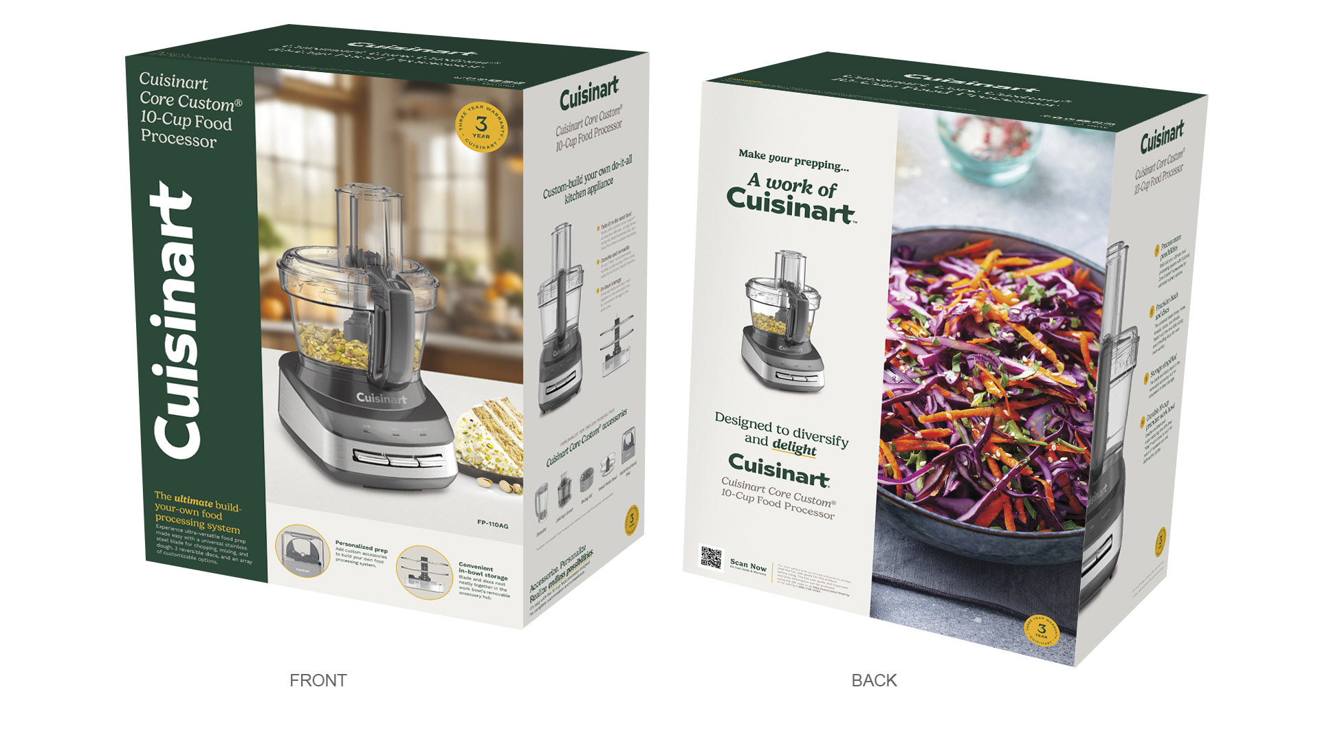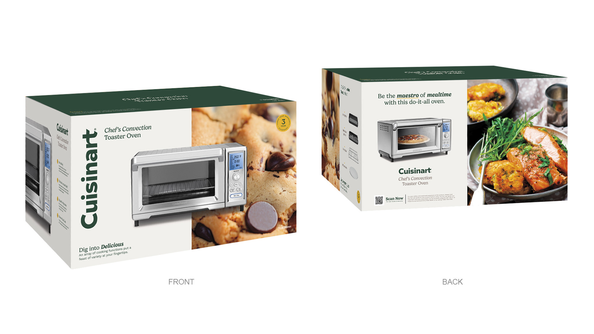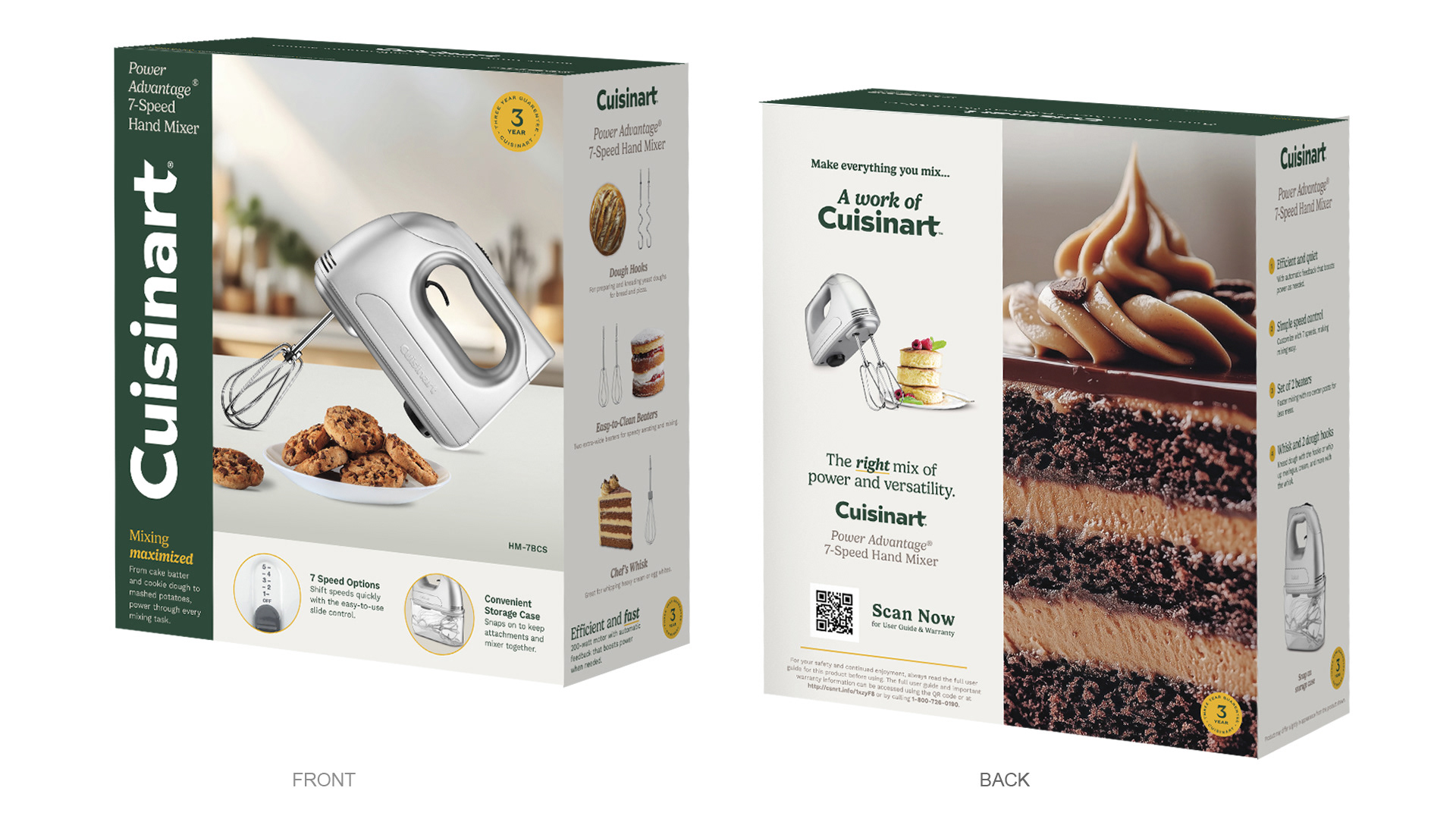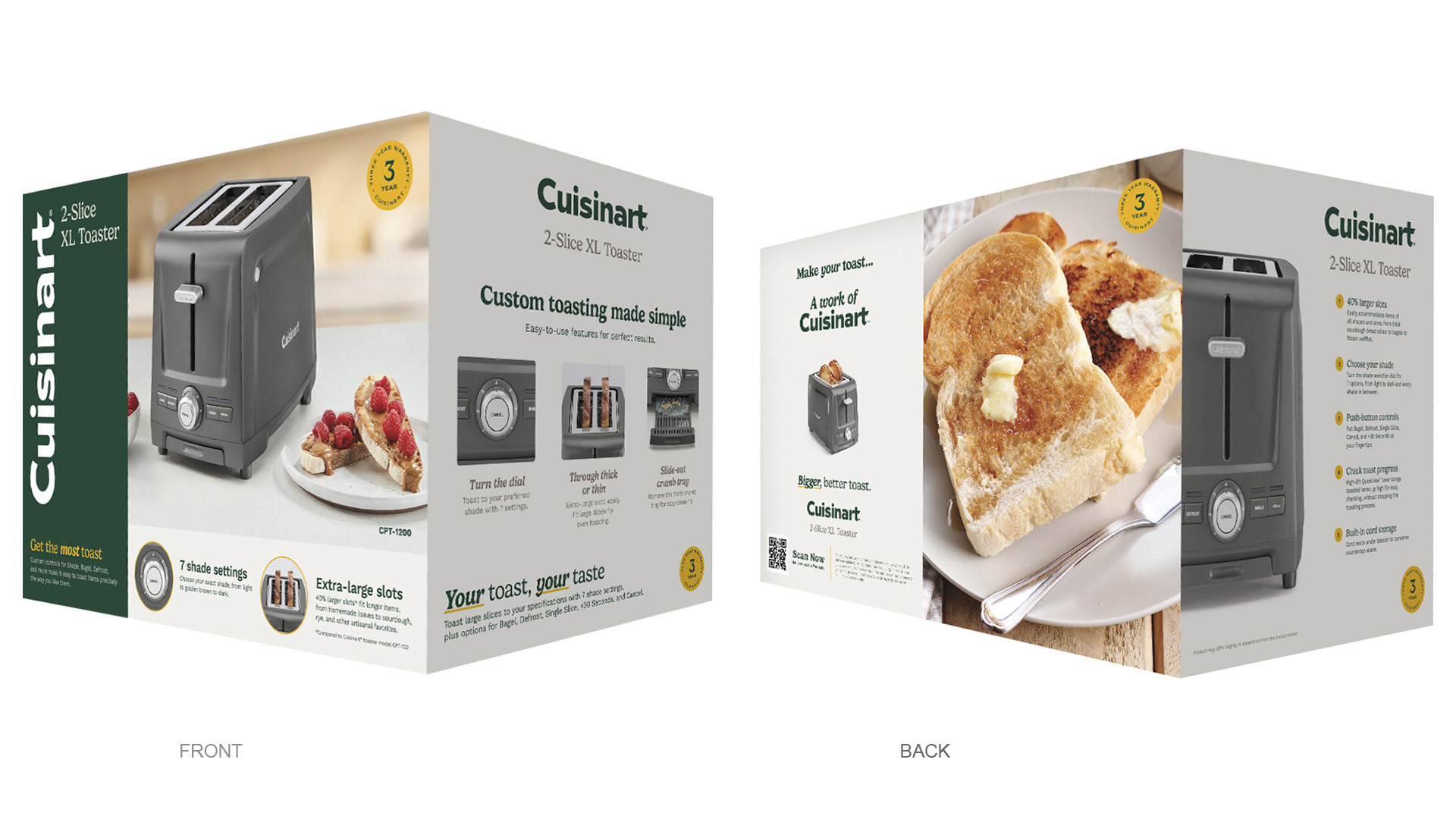 CUISINART REBRANDING PROJECT Chosen by the Creative Director to oversee a complete visual and strategic transformation of the brand redesign, over 150 package mechs incorporating Cusinart's new brand identity. Responsible for concept and design layout of all aspects of each product including photo selections, photoshoots, and composition for each package. Executed from initial design to final art production using Conair's Indesign proprietary art process system. Streamlined and implemented efficiencies in their system for a smoother and quicker execution of packaging mechanicals.