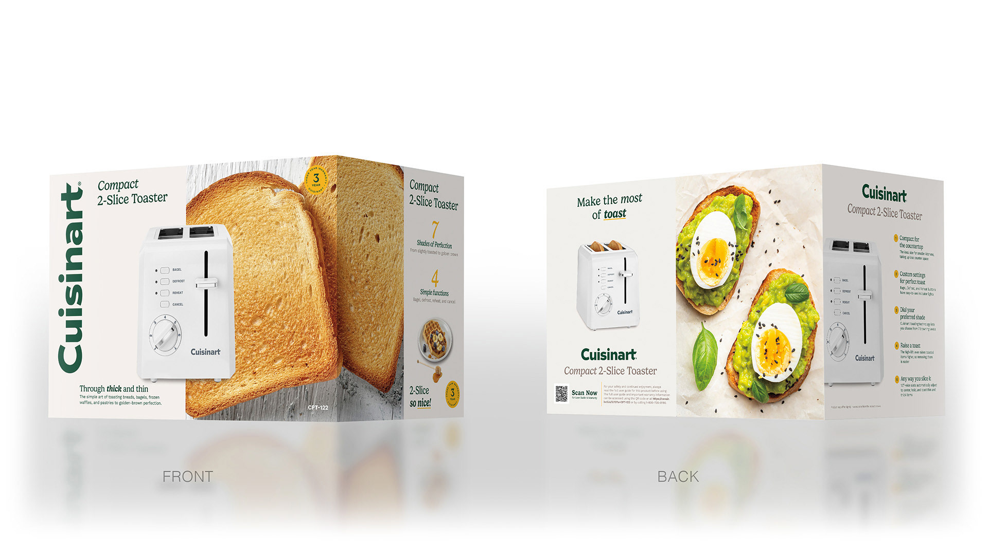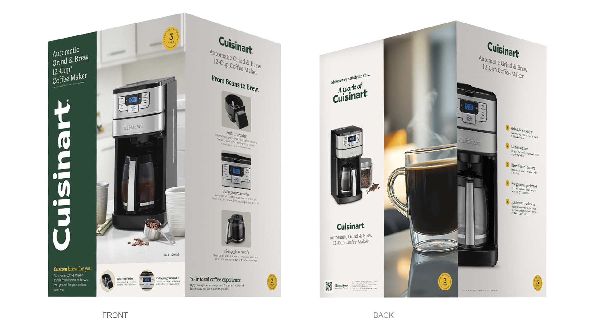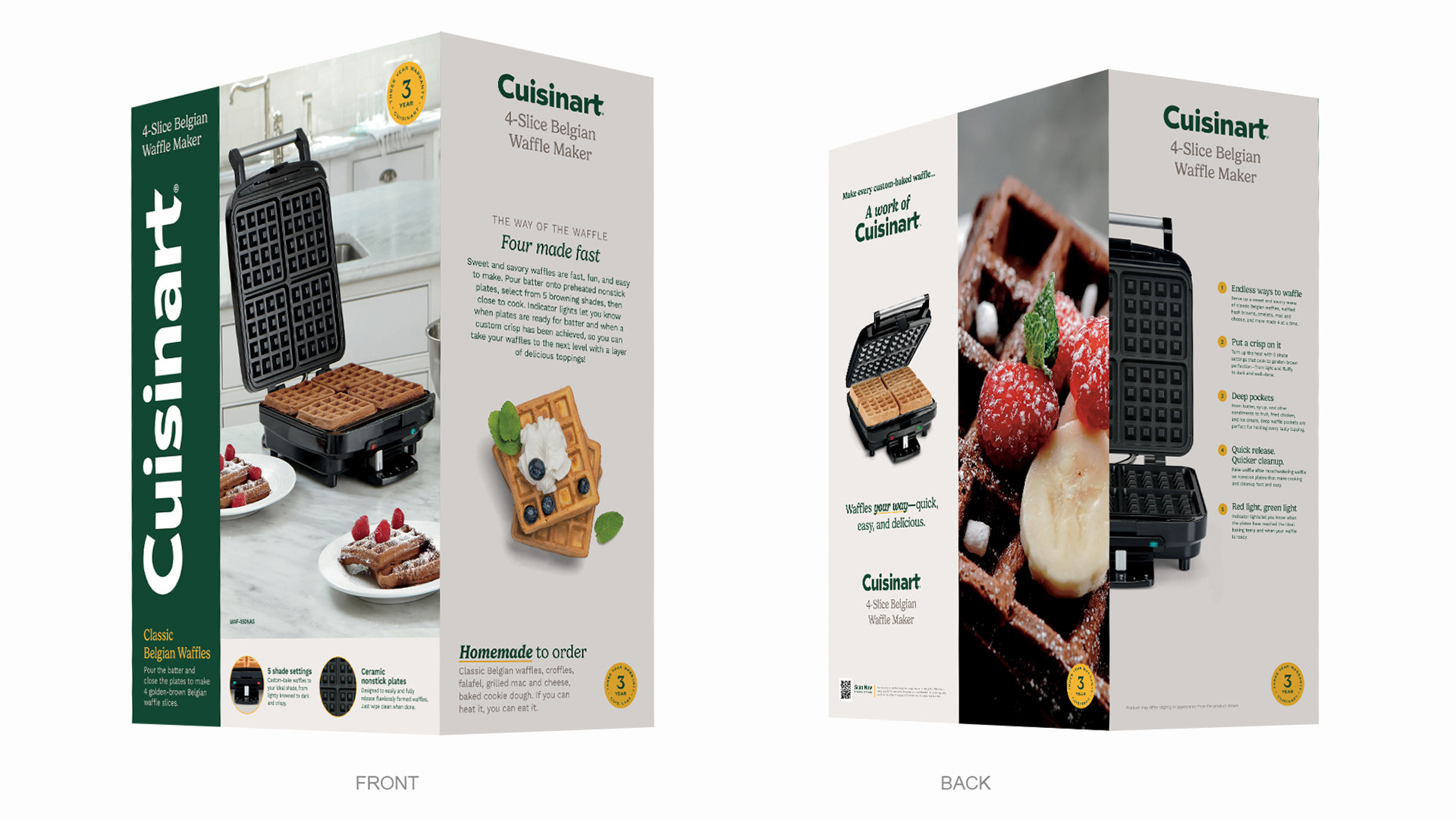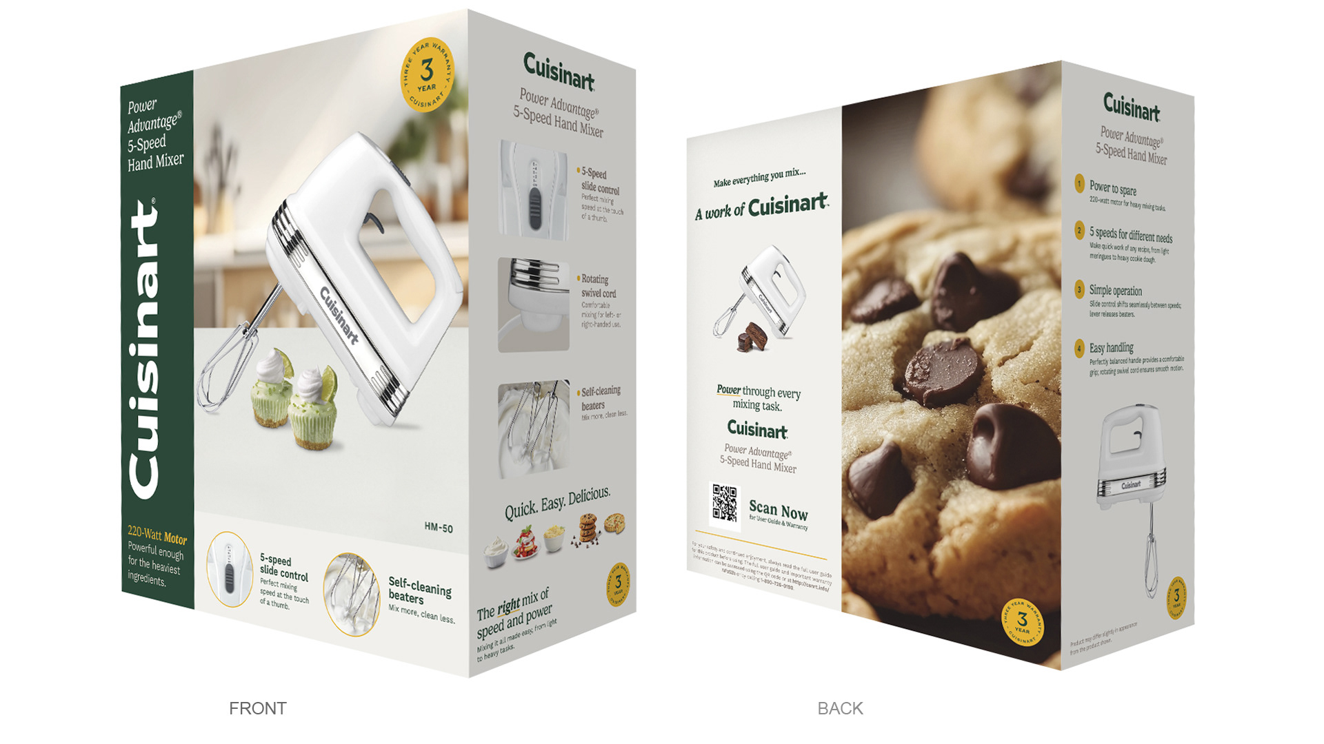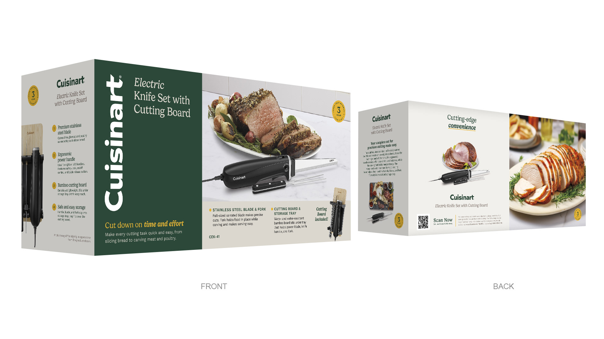 CUISINART REBRANDING PROJECT Chosen by the Creative Director to oversee a complete visual and strategic transformation of the brand redesign, over 150 package mechs incorporating Cusinart's new brand identity. Responsible for concept and design layout of all aspects of each product including photo selections, photoshoots, and composition for each package. Executed from initial design to final art production using Conair's Indesign proprietary art process system. Streamlined and implemented efficiencies in their system for a smoother and quicker execution of packaging mechanicals.