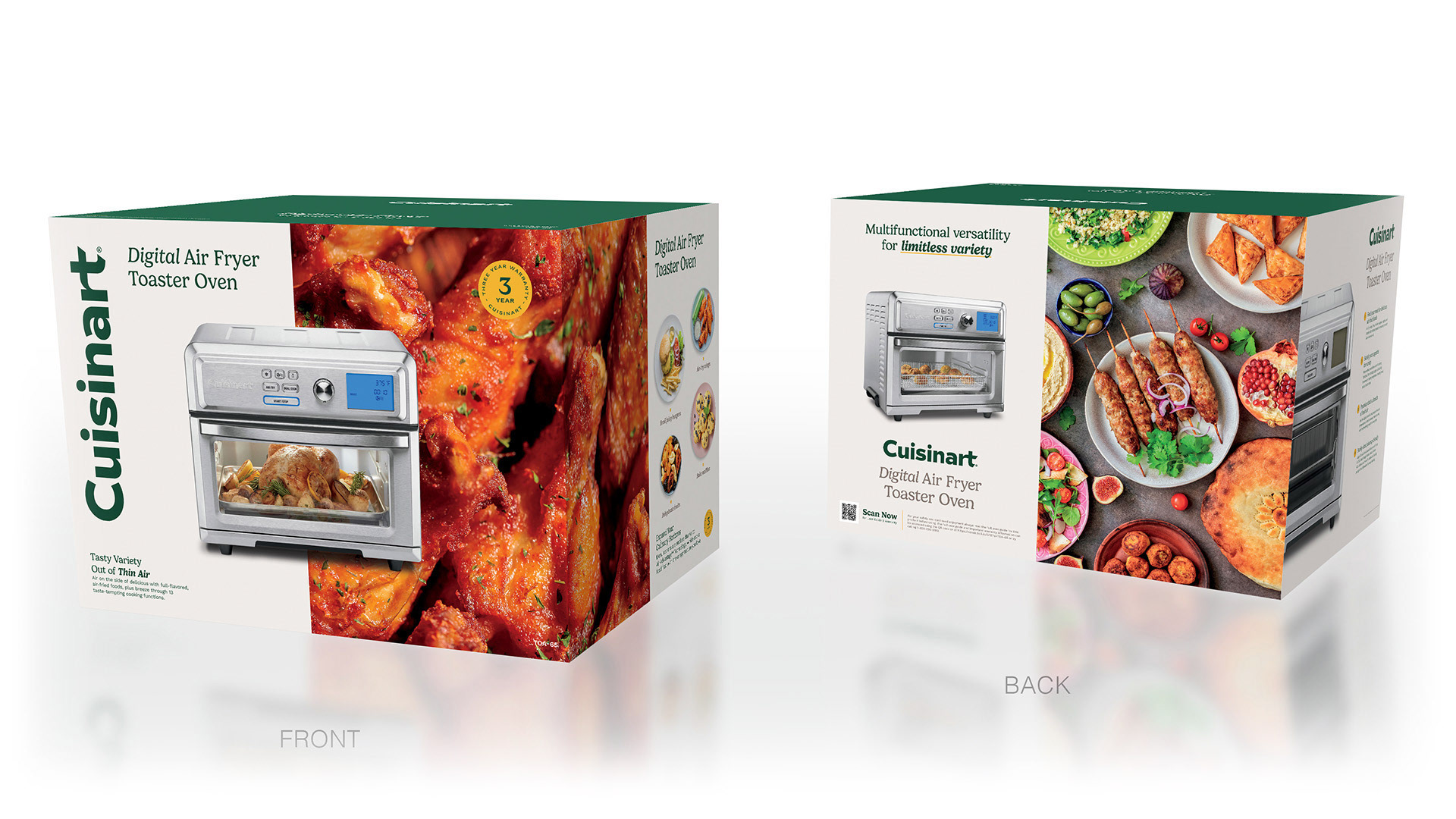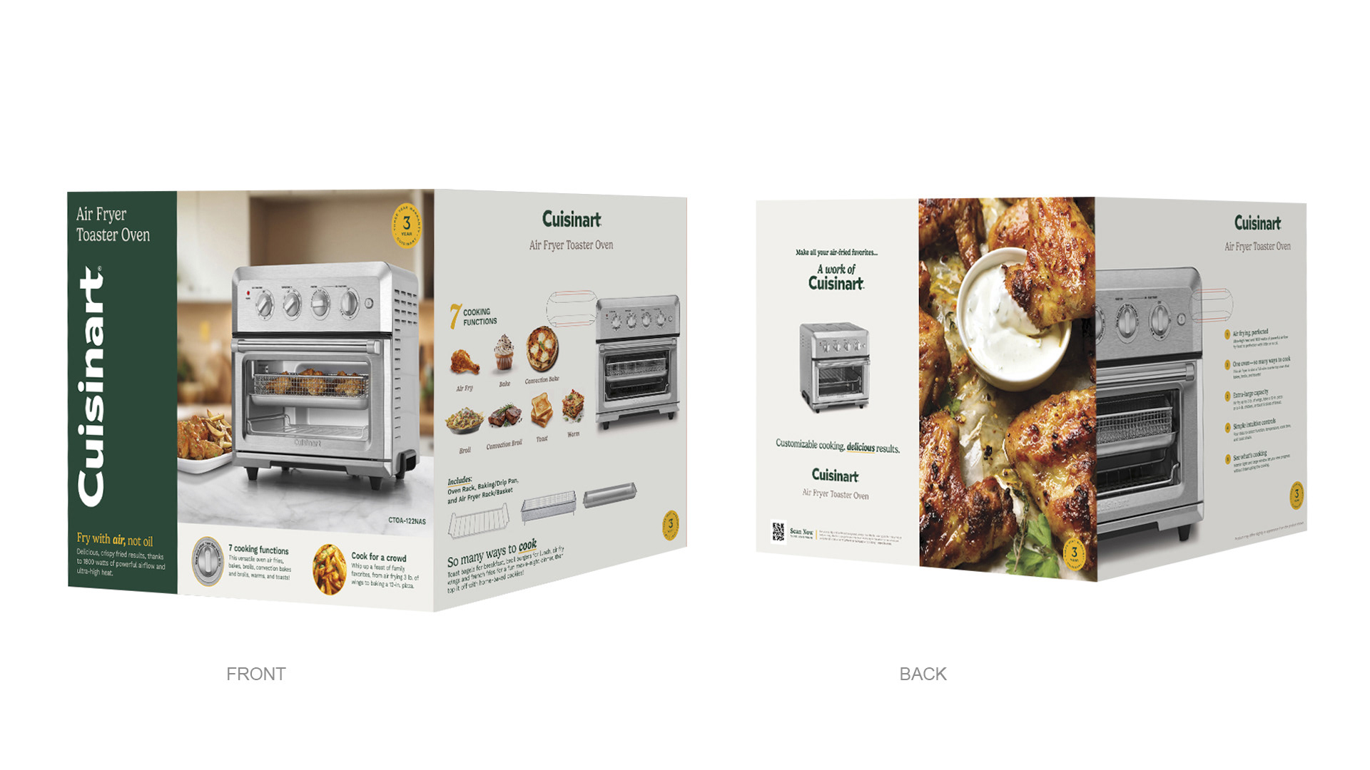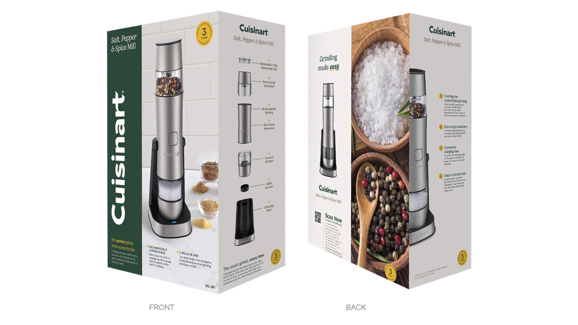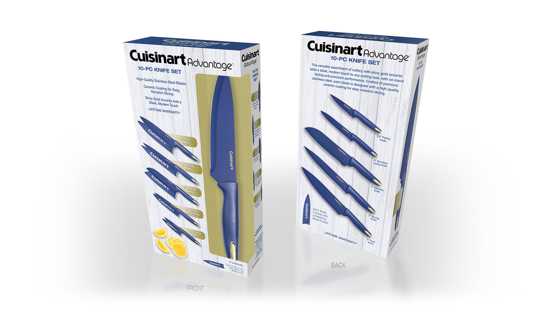 CUISINART REBRANDING PROJECT Chosen by the Creative Director to oversee a complete visual and strategic transformation of the brand redesign, over 150 package mechs incorporating Cusinart's new brand identity. Responsible for concept and design layout of all aspects of each product including photo selections, photoshoots, and composition for each package. Executed from initial design to final art production using Conair's Indesign proprietary art process system. Streamlined and implemented efficiencies in their system for a smoother and quicker execution of packaging mechanicals.