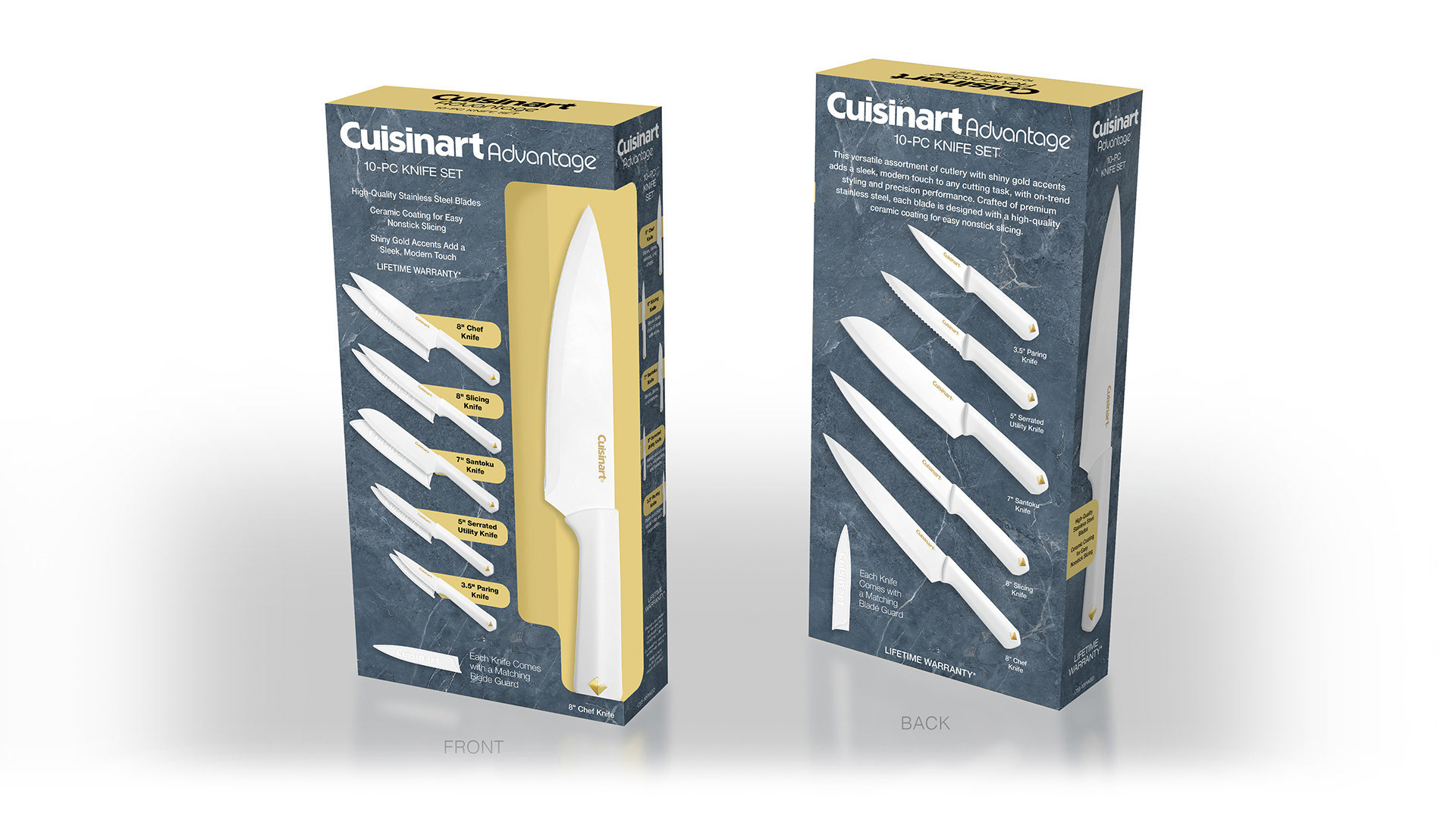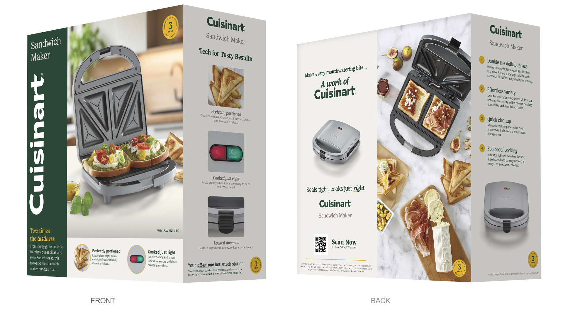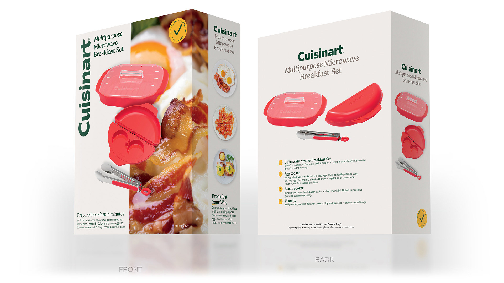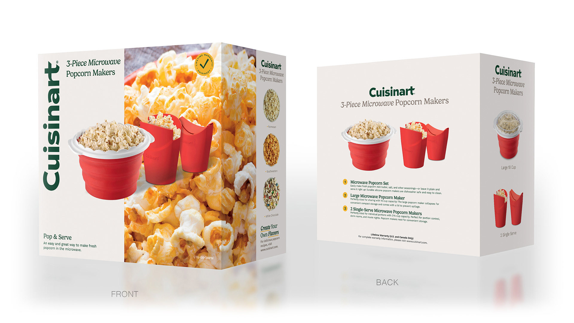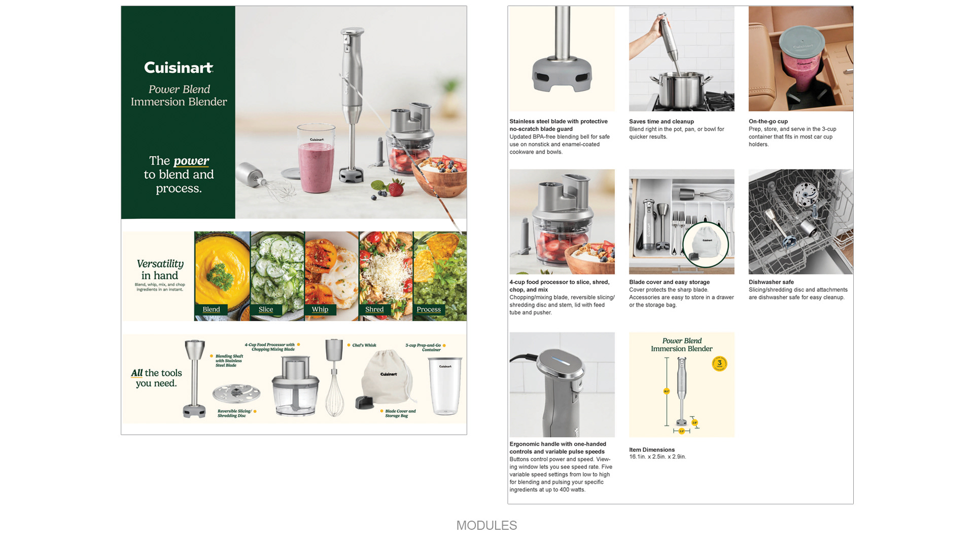 CUISINART REBRANDING PROJECT Chosen by the Creative Director to oversee a complete visual and strategic transformation of the brand redesign, over 150 package mechs incorporating Cusinart's new brand identity. Responsible for concept and design layout of all aspects of each product including photo selections, photoshoots, and composition for each package. Executed from initial design to final art production using Conair's Indesign proprietary art process system. Streamlined and implemented efficiencies in their system for a smoother and quicker execution of packaging mechanicals.