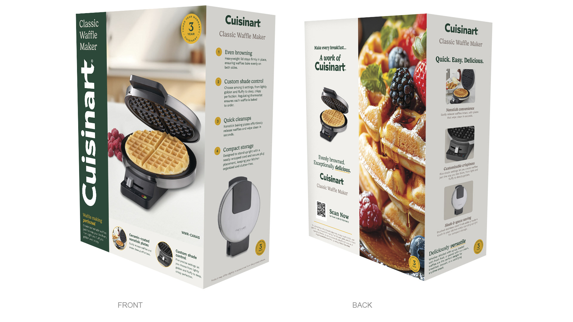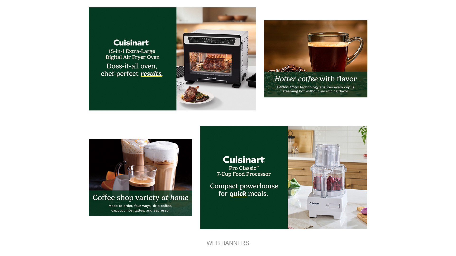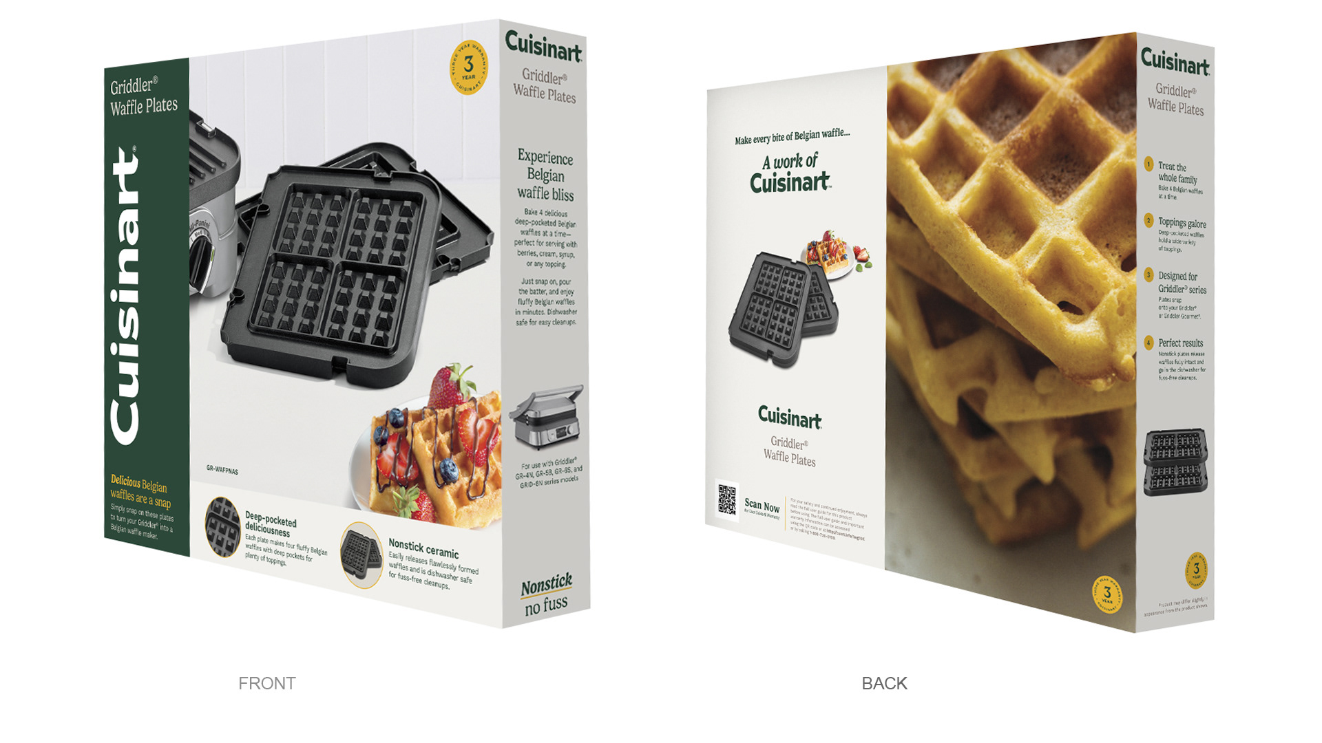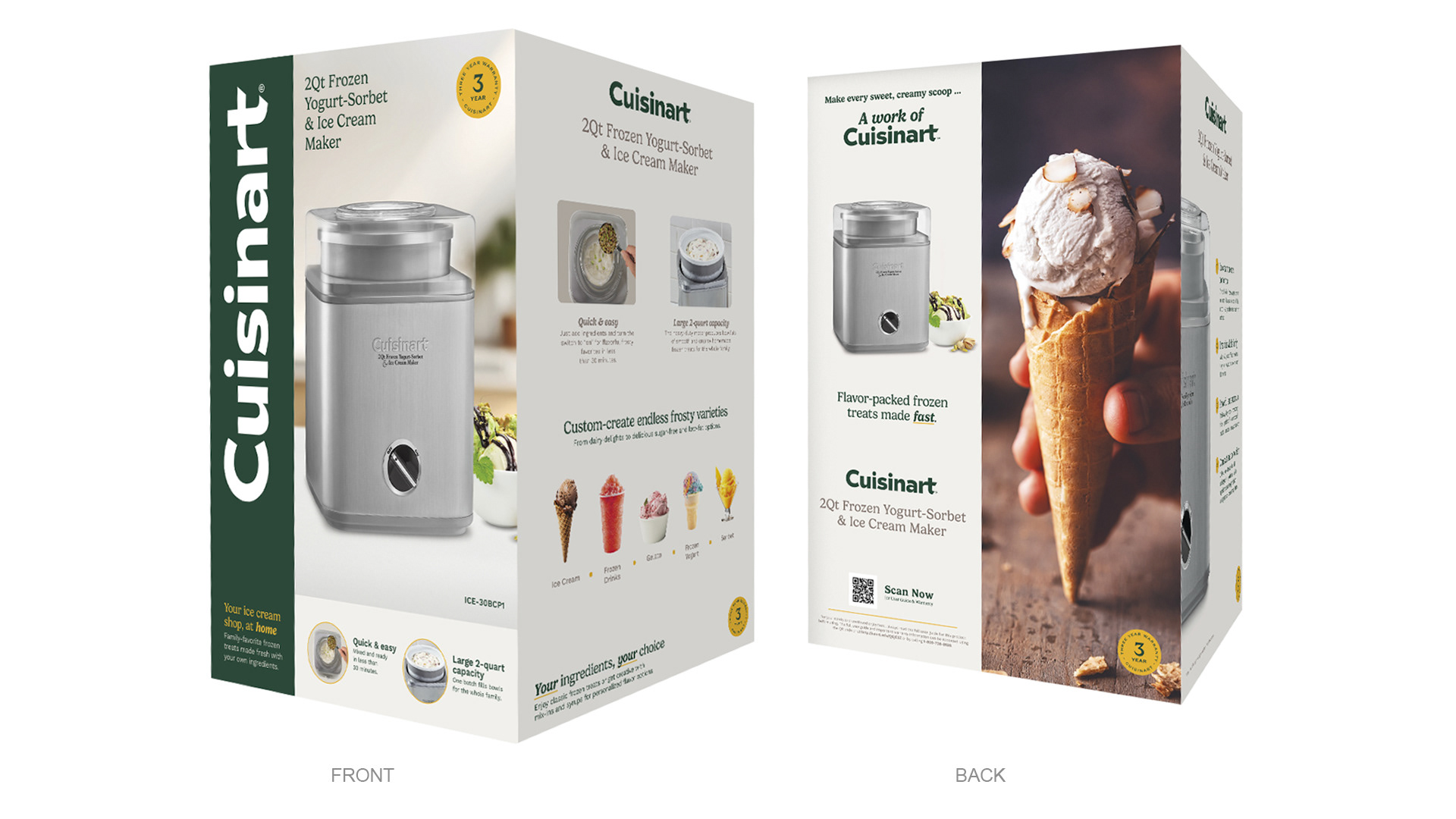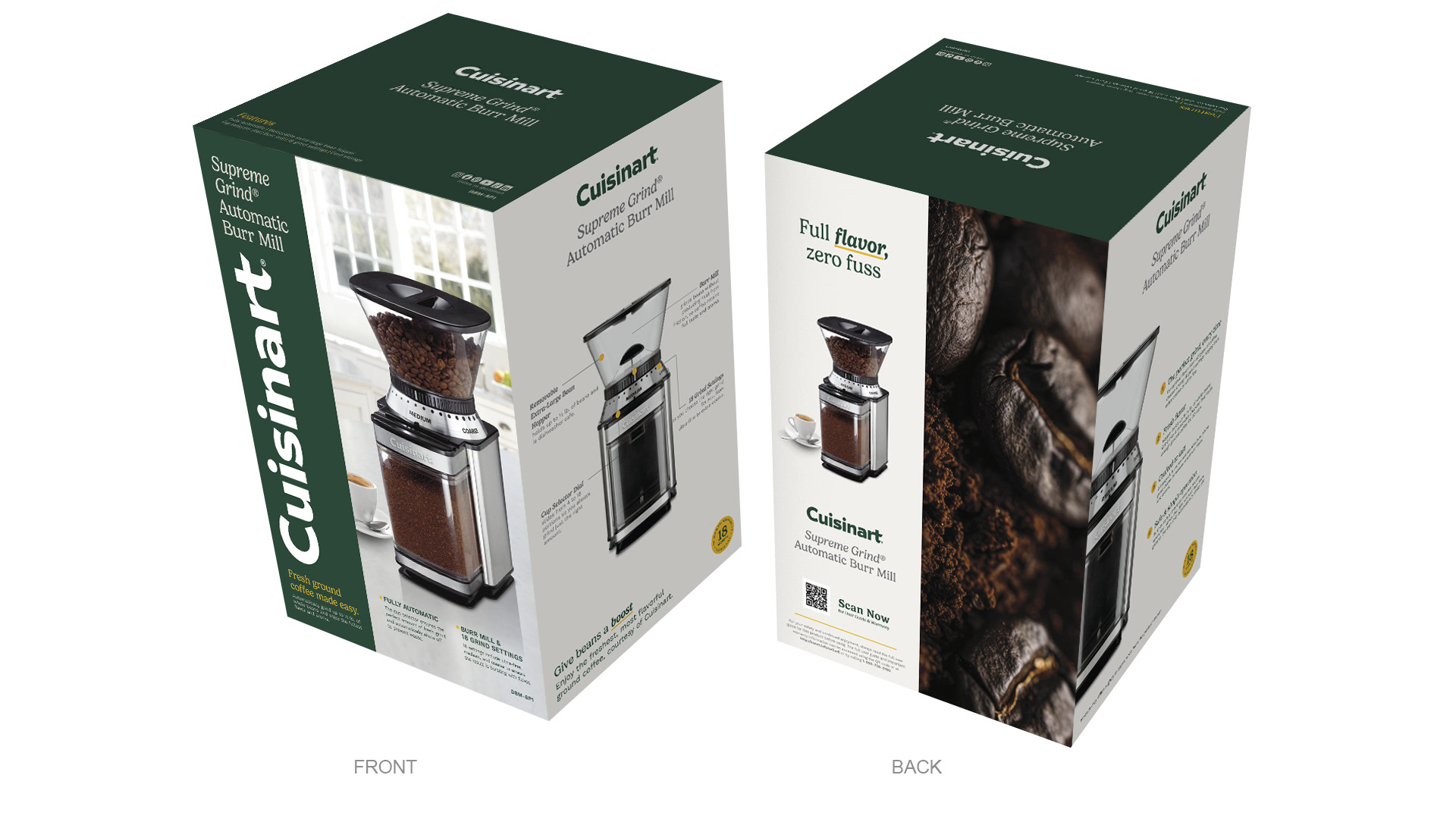 CUISINART REBRANDING PROJECT Chosen by the Creative Director to oversee a complete visual and strategic transformation of the brand redesign, over 150 package mechs incorporating Cusinart's new brand identity. Responsible for concept and design layout of all aspects of each product including photo selections, photoshoots, and composition for each package. Executed from initial design to final art production using Conair's Indesign proprietary art process system. Streamlined and implemented efficiencies in their system for a smoother and quicker execution of packaging mechanicals.