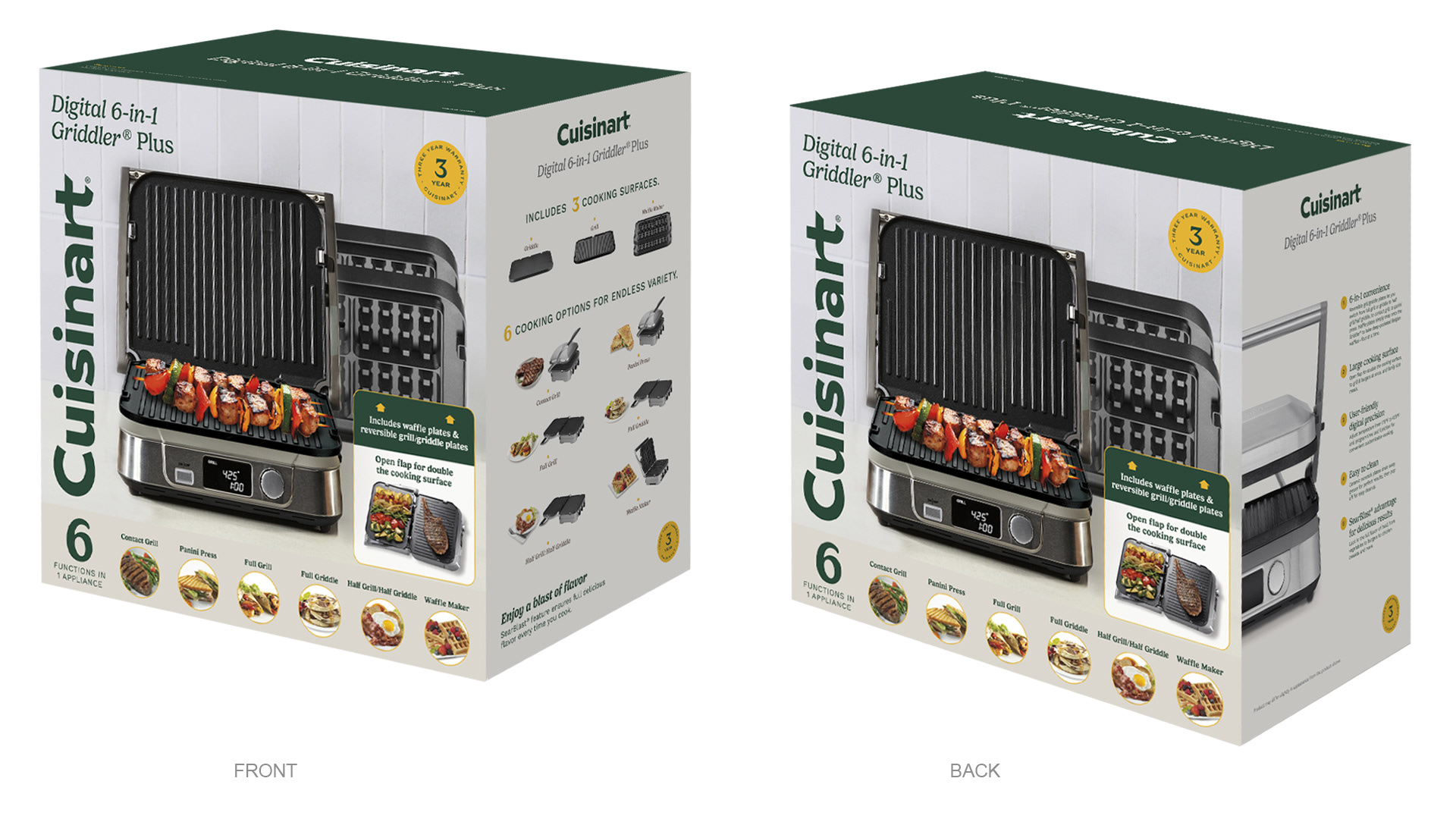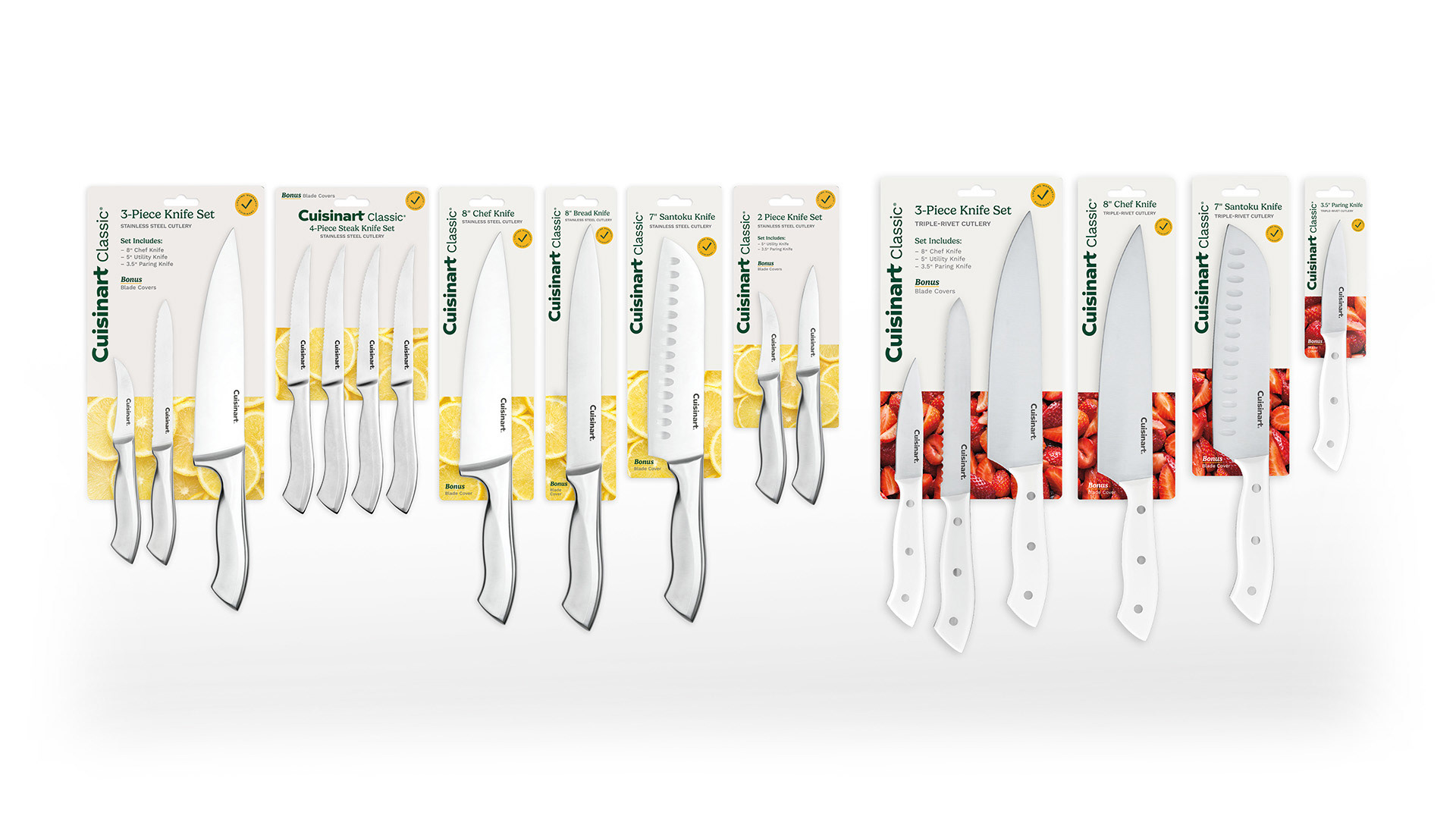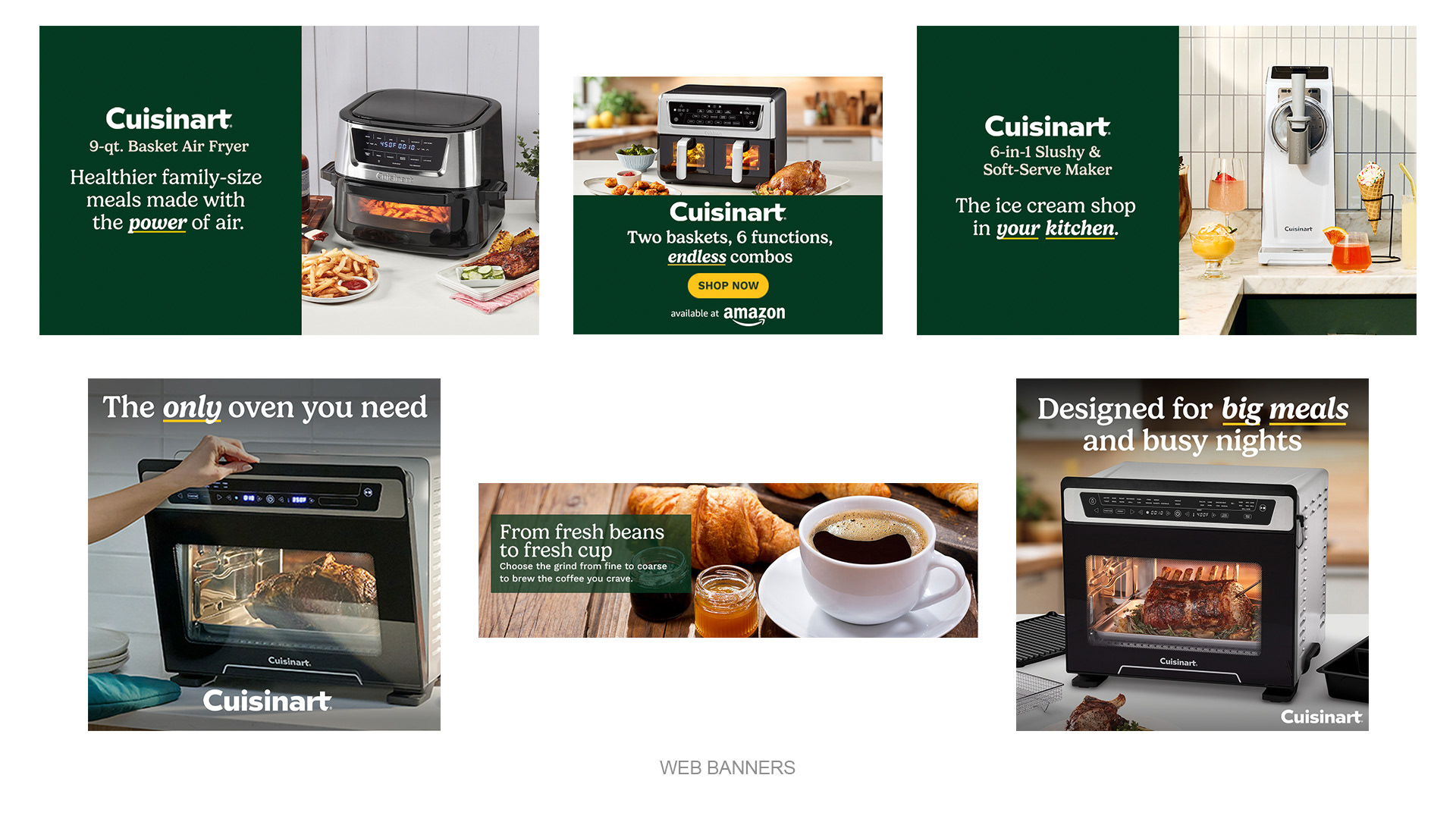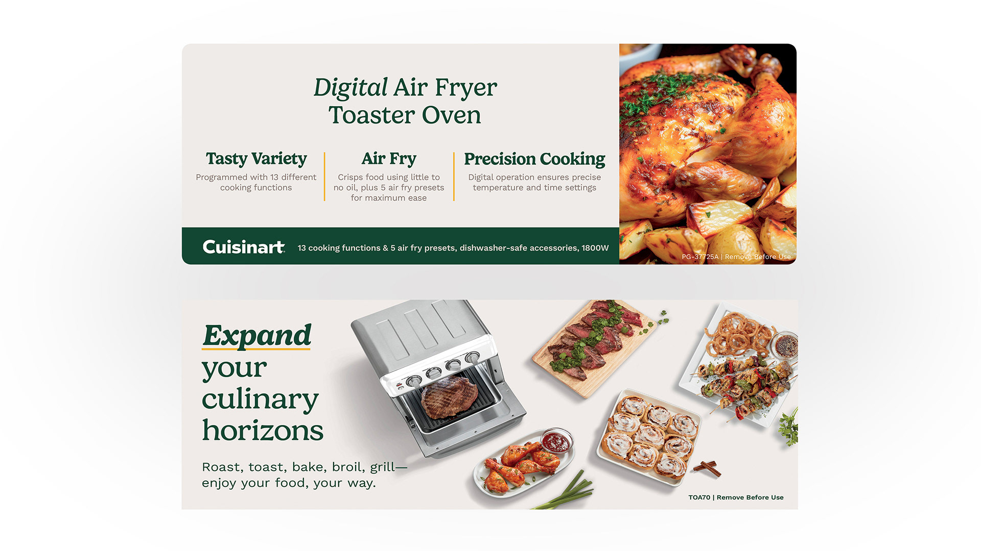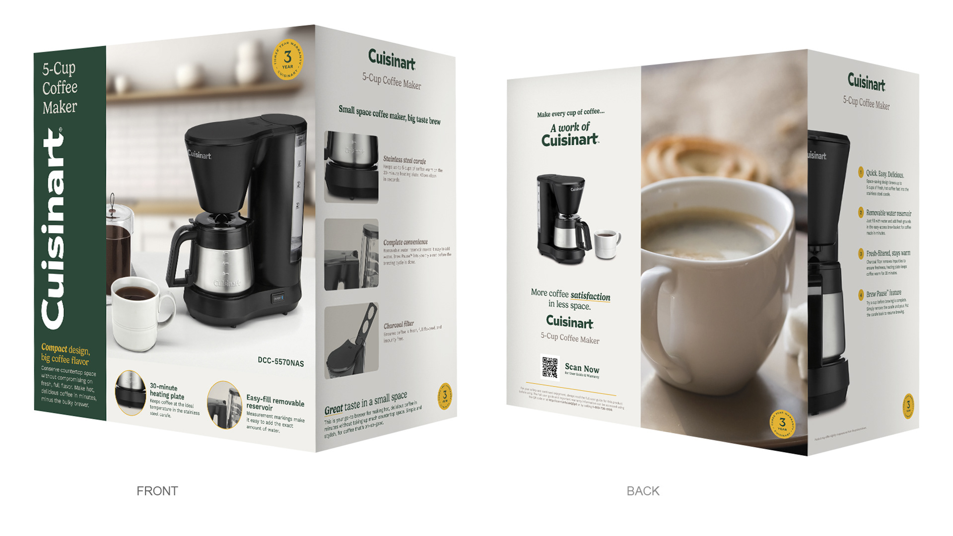 CUISINART REBRANDING PROJECT Chosen by the Creative Director to oversee a complete visual and strategic transformation of the brand redesign, over 150 package mechs incorporating Cusinart's new brand identity. Responsible for concept and design layout of all aspects of each product including photo selections, photoshoots, and composition for each package. Executed from initial design to final art production using Conair's Indesign proprietary art process system. Streamlined and implemented efficiencies in their system for a smoother and quicker execution of packaging mechanicals.