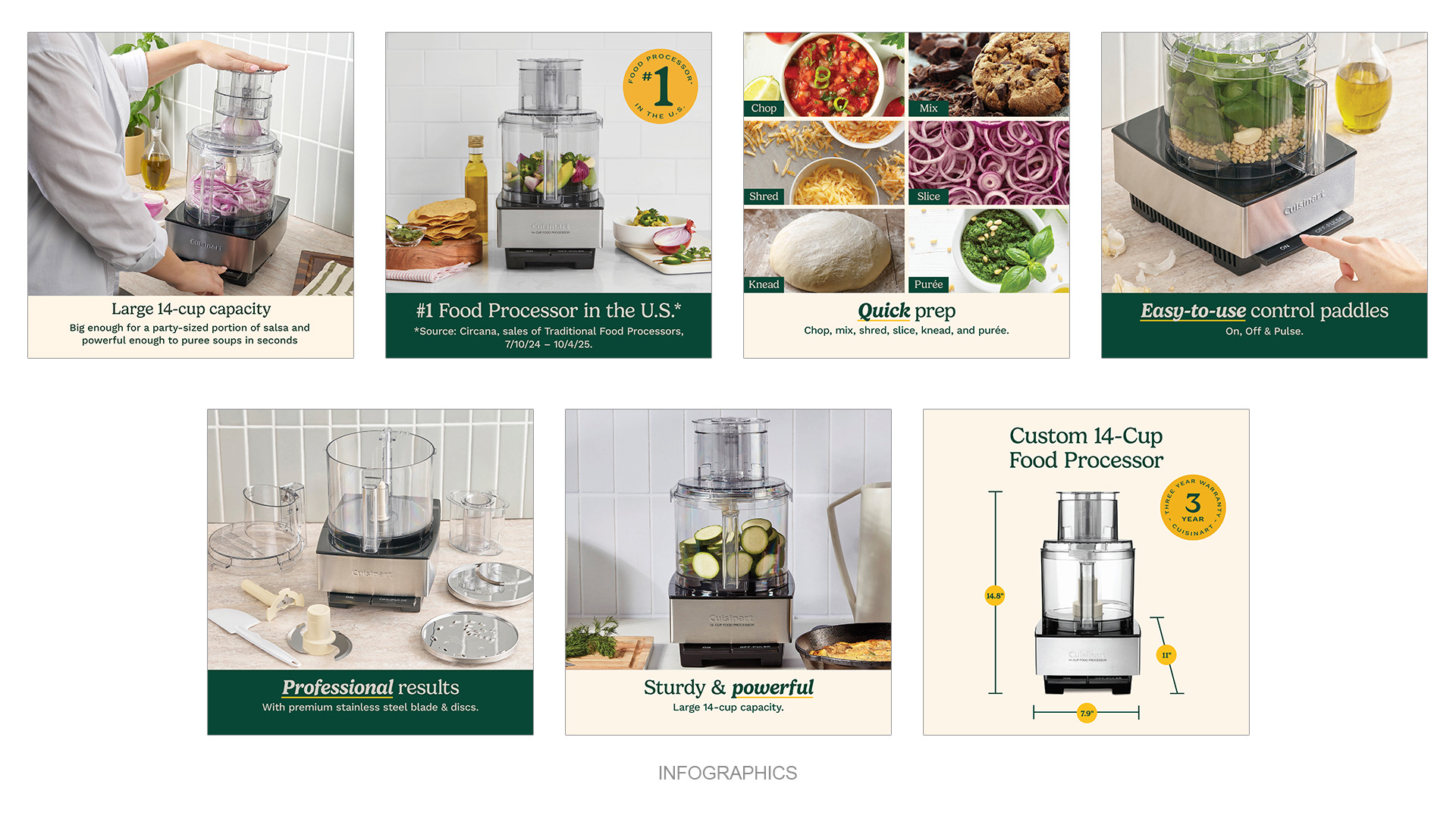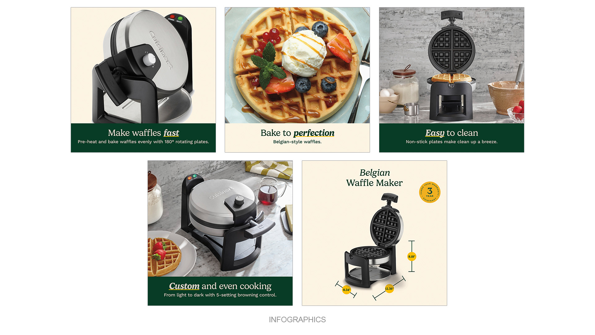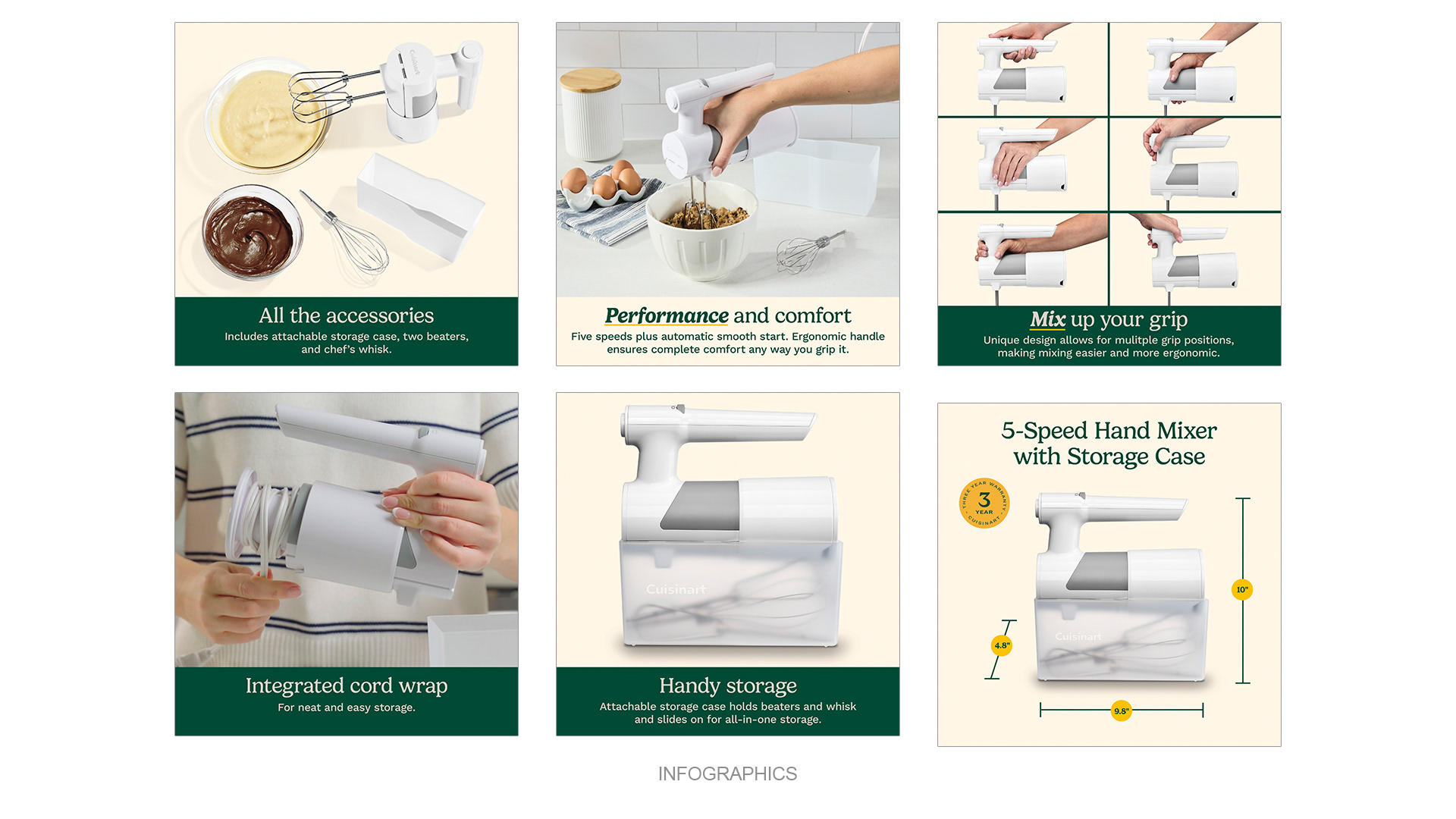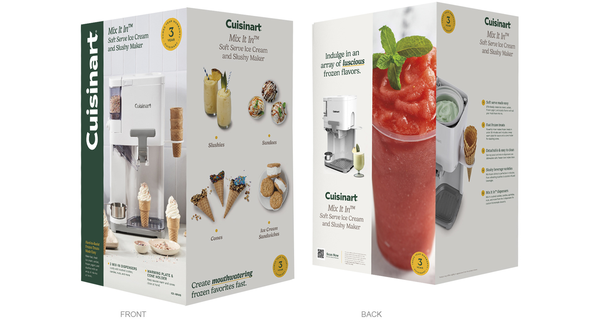 CUISINART REBRANDING PROJECT Chosen by the Creative Director to oversee a complete visual and strategic transformation of the brand redesign, over 150 package mechs incorporating Cusinart's new brand identity. Responsible for concept and design layout of all aspects of each product including photo selections, photoshoots, and composition for each package. Executed from initial design to final art production using Conair's Indesign proprietary art process system. Streamlined and implemented efficiencies in their system for a smoother and quicker execution of packaging mechanicals.