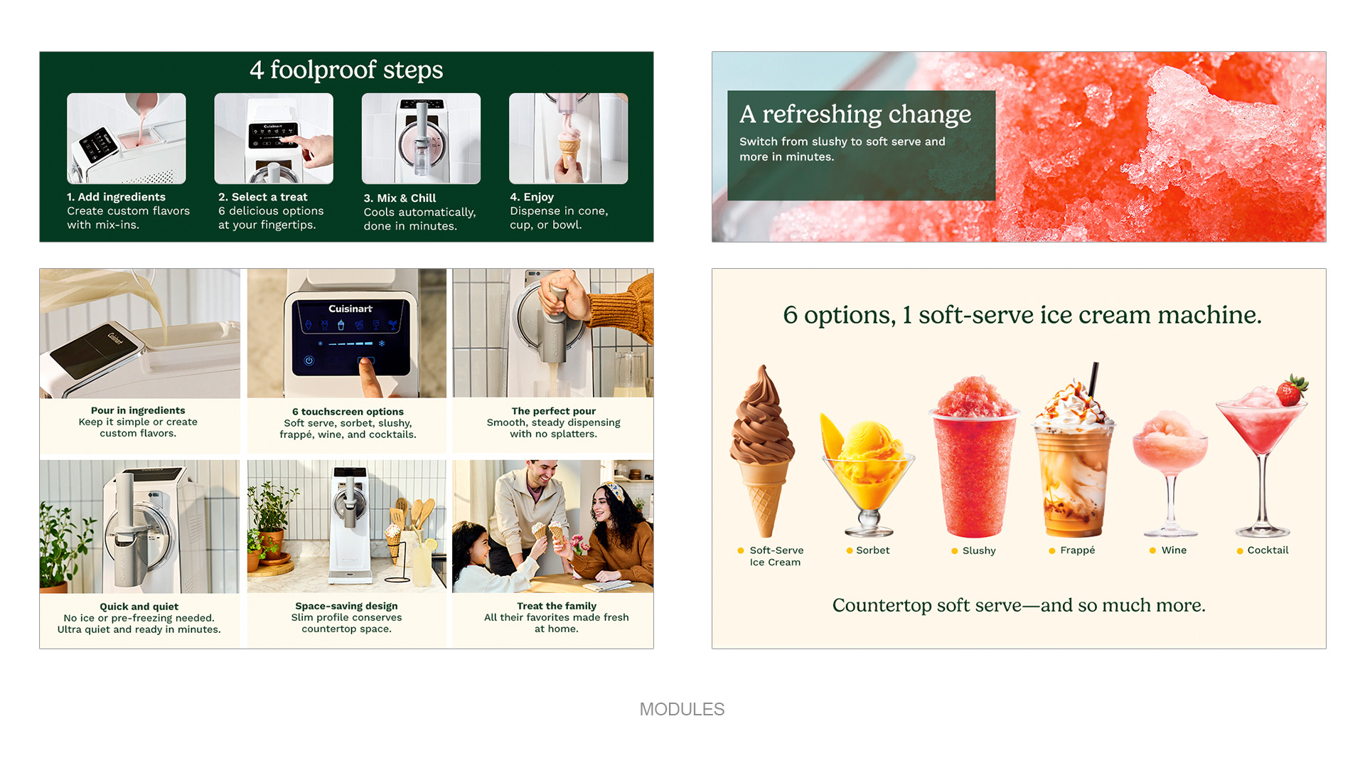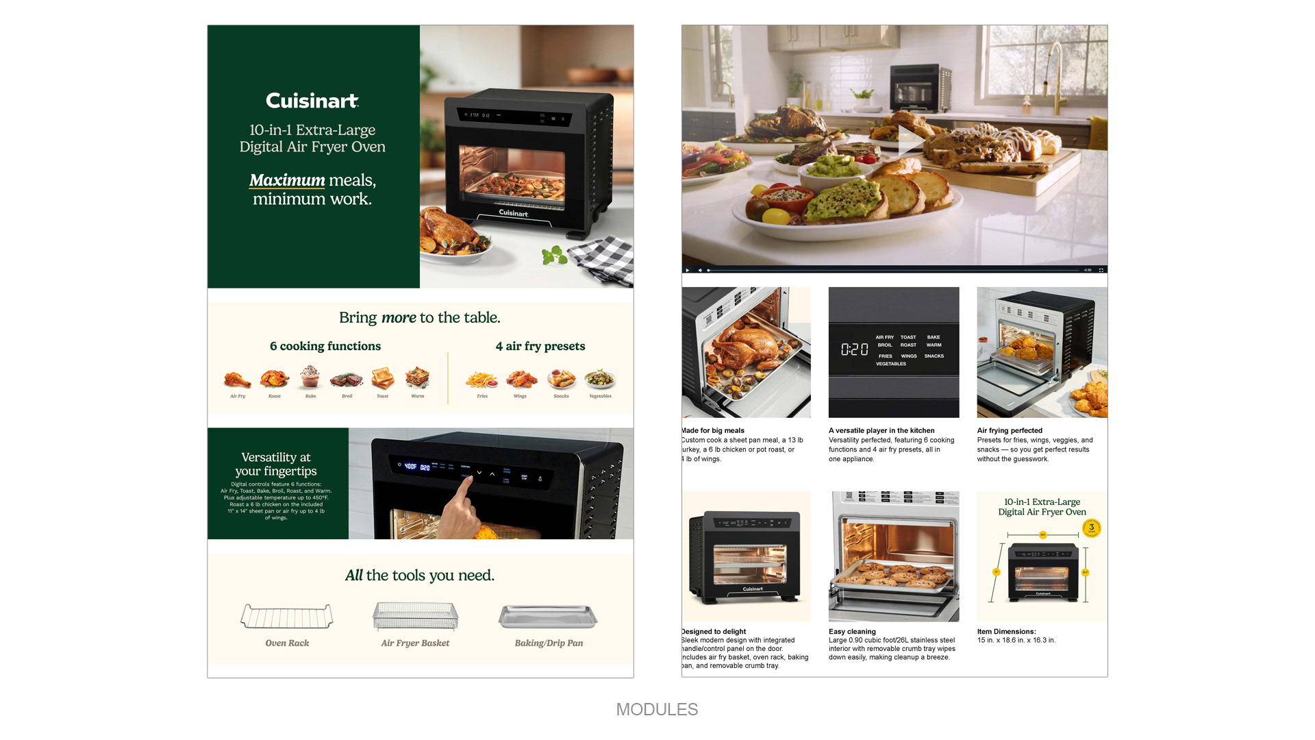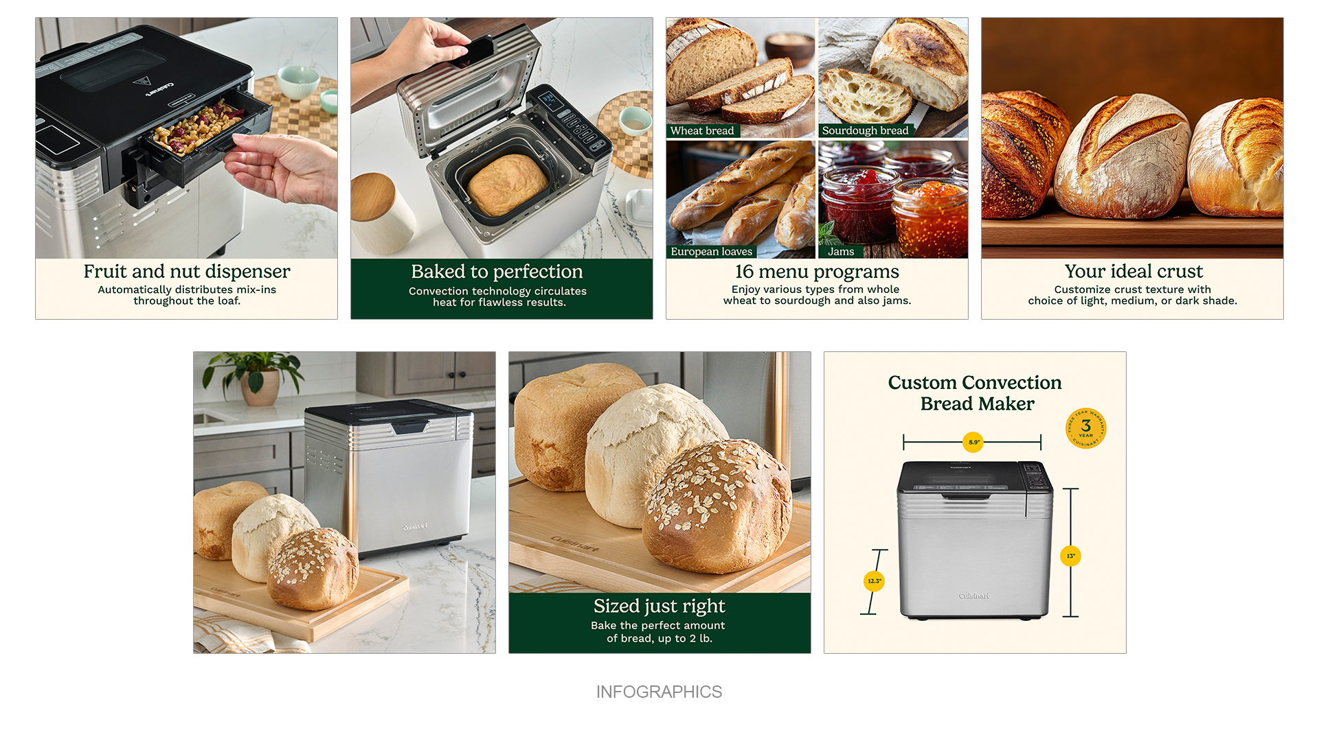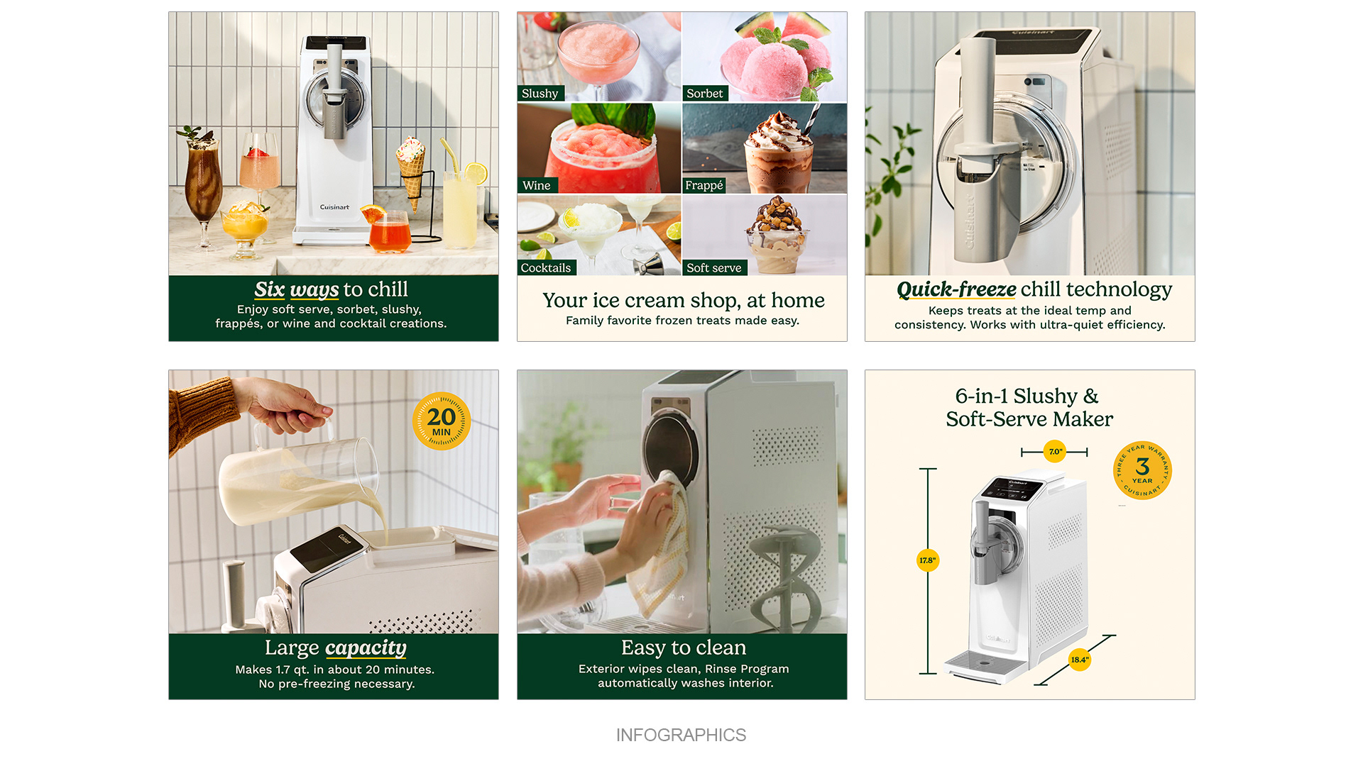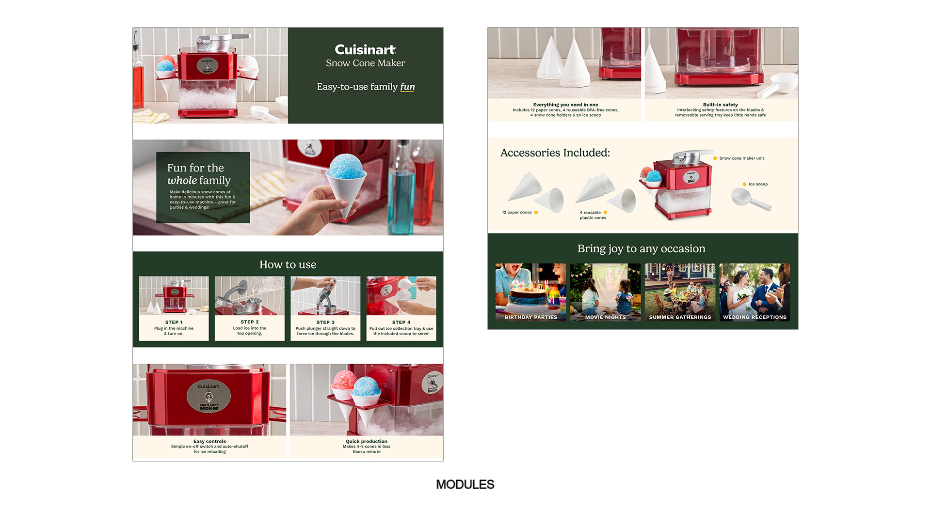 CUISINART REBRANDING PROJECT Chosen by the Creative Director to oversee a complete visual and strategic transformation of the brand redesign, over 150 package mechs incorporating Cusinart's new brand identity. Responsible for concept and design layout of all aspects of each product including photo selections, photoshoots, and composition for each package. Executed from initial design to final art production using Conair's Indesign proprietary art process system. Streamlined and implemented efficiencies in their system for a smoother and quicker execution of packaging mechanicals.
